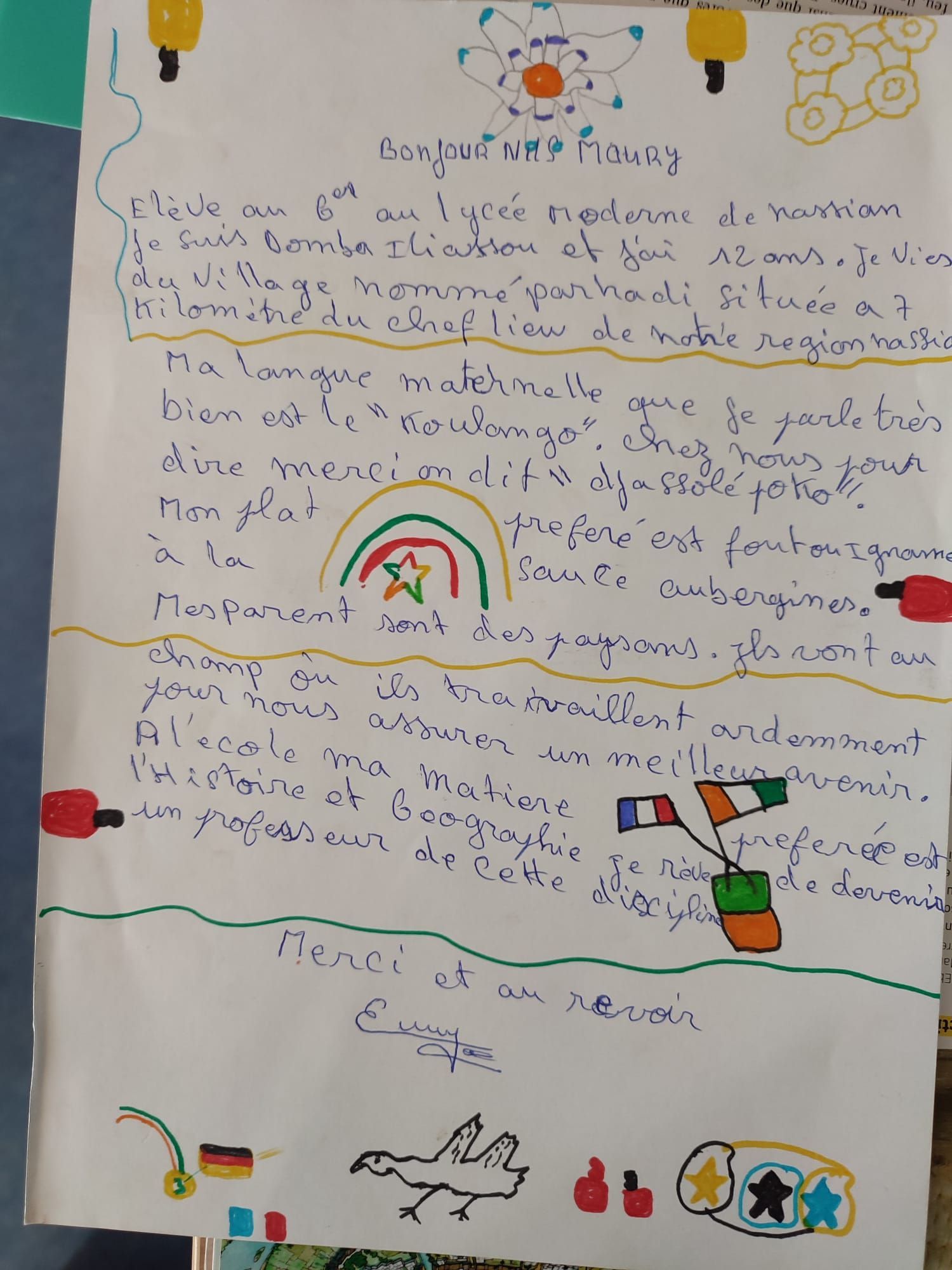 Die ersten Briefe wurden Ende Dezember 2023 persönlich an zwei Schulen in der Nähe des Comoé Nationalparks gebracht. In den Ortschaften Banvayo und Nassian haben sich um die 60 Schüler*innen auf Briefe, sowie Fotos und Informationsplakate über Freiburg und das DFG gefreut. Die Antworten konnten auch schon im Januar zurück gebracht werden und die Neugierde war in der 6ème1 & 2 des DFGs groß. Obwohl der Austausch gerade erst begonnen hat, scheint er bereits vielversprechend zu sein. Einen großen Dank an Madame Husson und ihre Schüler*innen für deren Zeit und Motivation!